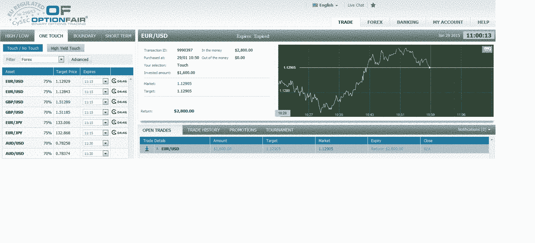 I logged in the OptionFair™ binary options trading platform and I traded $1600 on the "Touch Down" instrument. This kind of option has a return of 75% if the option touches the strike price prior to expiry, which means that if the signal is correct, I could get a return of $1200 on my investment.