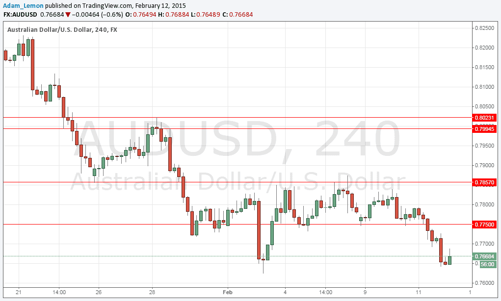 The key level that needed to be broken down yesterday to precipitate the fall was recent support confluent with a key psychological number at 0.7750. After this was broken, during the Australian session there was a release of very poor economic data for the AUD, which drove the price down further and completed the move.