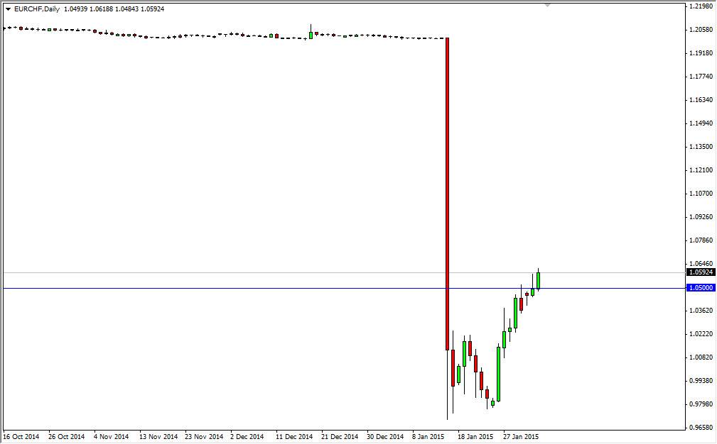 I believe that some large, round, psychologically significant number above will cause quite a bit of resistance and we will get a resistive candle from which to short. However, we have to see how much profit taking there is, and we also have to recognize that the Euro in general is getting a little bit of a reprieve at the moment in the Forex markets. That of course carries over into this pair, but ultimately this is a market that is simply too dangerous to start buying. If I was to buy the Euro, it would be in a different pair, and not what is essentially “Ground Zero” of the Swiss franc story right now.