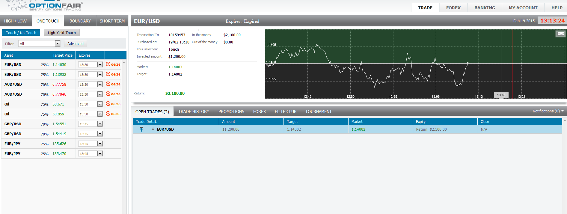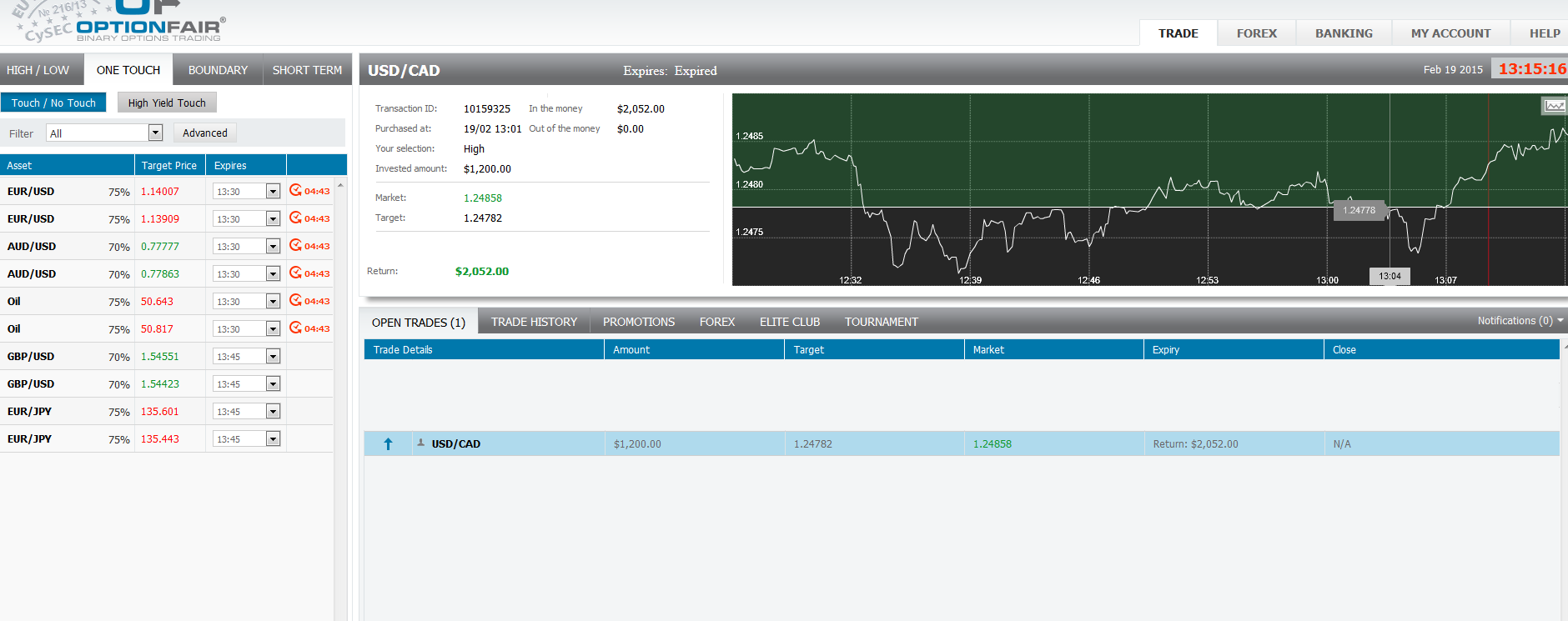 I logged in the OptionFair™ binary options trading platform and I traded $1200 on the "Touch Up" instrument. This kind of option has a return of 75% if the option touches the strike price prior to expiry, which means that if the signal is correct, I could get a return of $900 on my investment.
