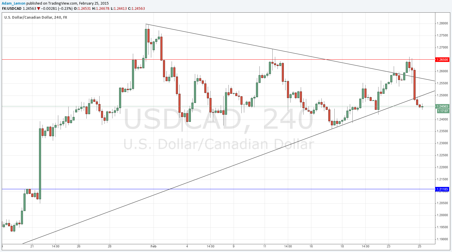 I had forecast the day before yesterday that we were likely to get a temporary excursion above 1.2600 but that we would not exceed 1.2650. This was proved to be correct. The following day we again seemed to break quite smoothly and steadily above the bearish trend line, so the pair seemed to making a sustainable bullish breakout. However, the resistance at around 1.2650 held again, and then there was bearish USD sentiment caused by news during yesterday’s New York session, followed shortly by the same thing in reverse for the CAD, so the pair plummeted. Now we are looking at a bearish breakout of the triangle!