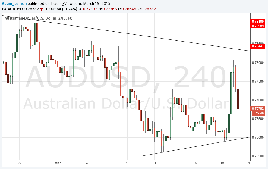 The bad news for USD bulls that was released by the FOMC yesterday sent this pair soaring upwards, past two anticipated resistance levels. However the price finally did turn around at a logical point: a long term trend line confluent with a double top at 0.7844. The price turned around there and has been falling sharply in line with the longer-term trend. Due to this sharp move we are too far away from any obvious shorting levels. However, there has been a bullish lower high below which gives us the bottom of a consolidating triangle. This trend line is confluent with a whole number at 0.7600 and if we reach it today after this long fall, it will be a very logical place for a bullish bounce to occur.