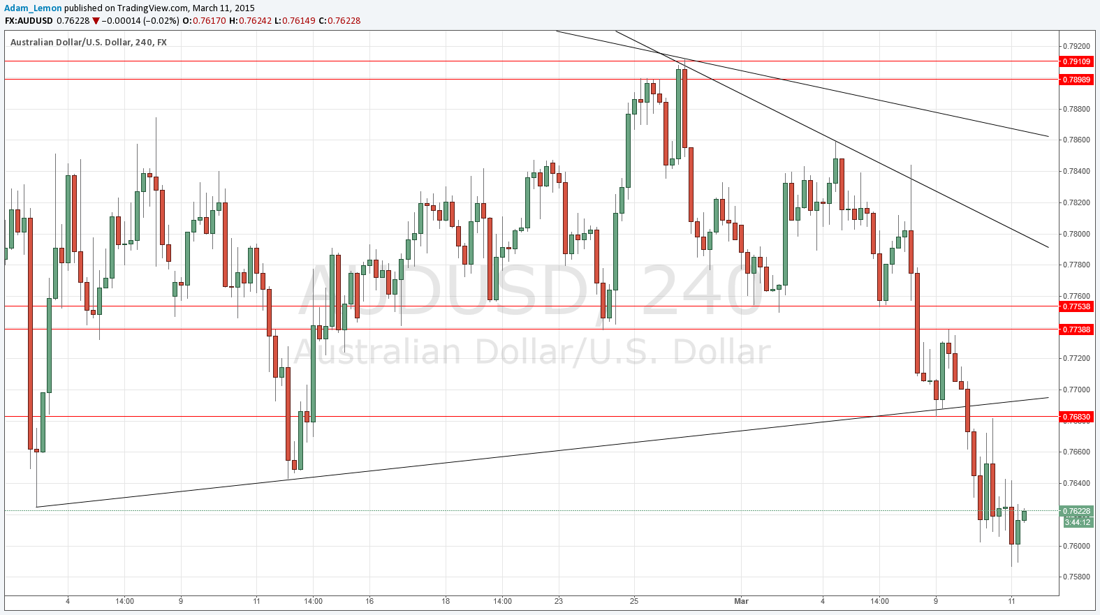 The whole number at 0.7600 has provided some local support but this is unlikely to last. The price can be expected now to proceed down. There are no obviously supportive levels close by but the psychological number at 0.7500 has a good chance of producing a moderate bullish bounce.