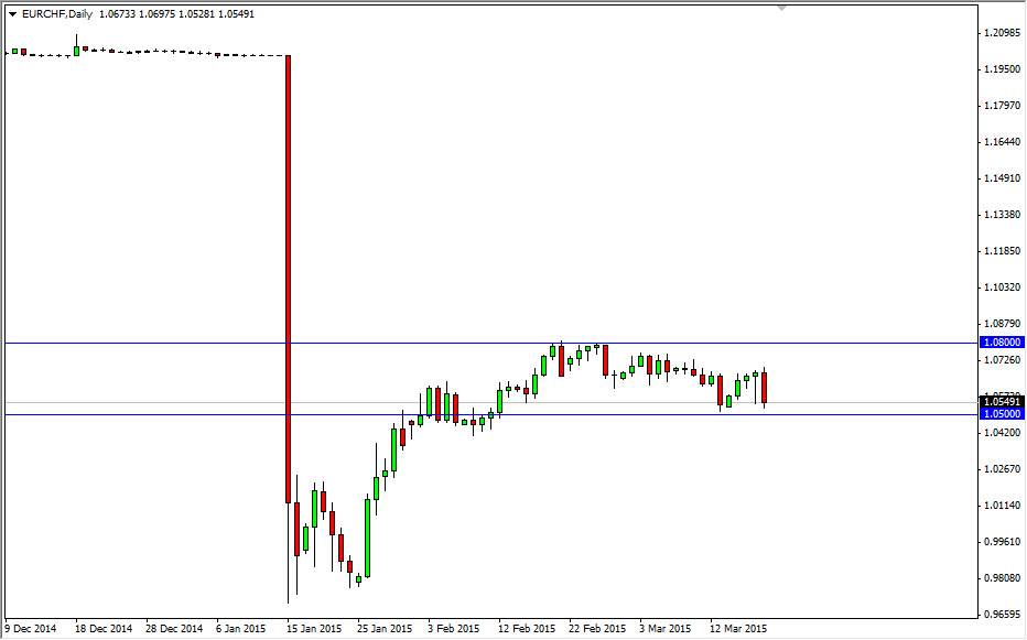 The EUR/CHF pair is in exactly exciting to trade these days, as last couple of weeks have been fairly quiet. However, one of the things that I like the most about this pair is that it tends to be fairly reliable. We have clearly carved out a consolidation area between the 1.05 level on the bottom, and the 1.08 level on the top. Ultimately, I do think we break out of this range but in the meantime it does look like the market is going to respect the two levels. With that being said, I believe that we may see a potential buying opportunity.
