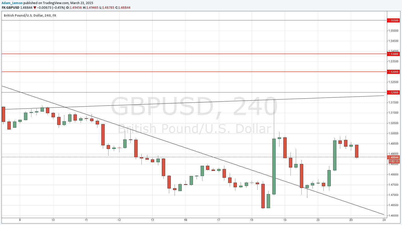 I had expected that the most likely scenario was one in which the price found support at 1.4853 and then continued to move upwards. In fact, the price fell further, before moving up to around 1.5000, from where it has fallen again. It seems quite possible that the psychological importance of 1.5000 will keep this level as resistant for at least a while, although I am not looking for any short trade to set up there.