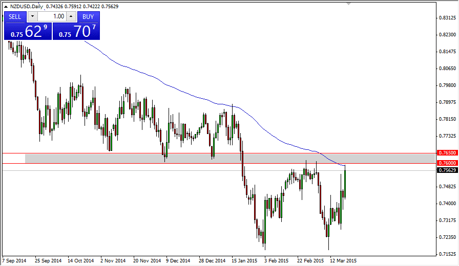 The NZD/USD pair rallied during the session on Friday, but as you can see slammed into the resistance barrier that I have been paying attention to. I believe that the 0.76 level is the beginning of a 50 pip resistance barrier, as marked upon the chart. Another thing that I would notice here is that the 100 day exponential moving average is touching the top of the candle for the session, so I believe that we are going to start seeing a bit of resistance in the general vicinity. But then, I am simply looking for resistant candle in order to start selling the New Zealand dollar, as I do not trust any type of rally at this point in time.