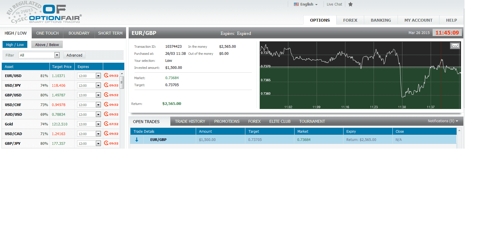The target price for EUR/GBP at the buying time (11:38) was 0.73705 for the expiration of 11:45. The Asset closed on 0.73684 and I made $1065.