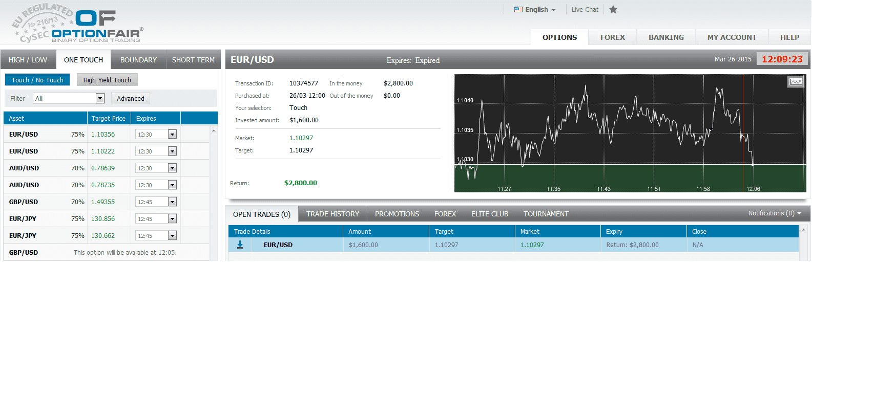 I logged in the OptionFair™ binary options trading platform and I traded $1600 on the "Touch Down" instrument. This kind of option has a return of 75% if the option touches the strike price prior to expiry, which means that if the signal is correct, I could get a return of $1200 on my investment.