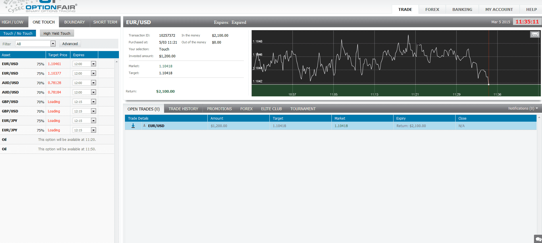 I logged in the OptionFair™ binary options trading platform and I traded $1200 on the "Touch Down" instrument. This kind of option has a return of 75% if the option touches the strike price prior to expiry, which means that if the signal is correct, I could get a return of $900 on my investment.