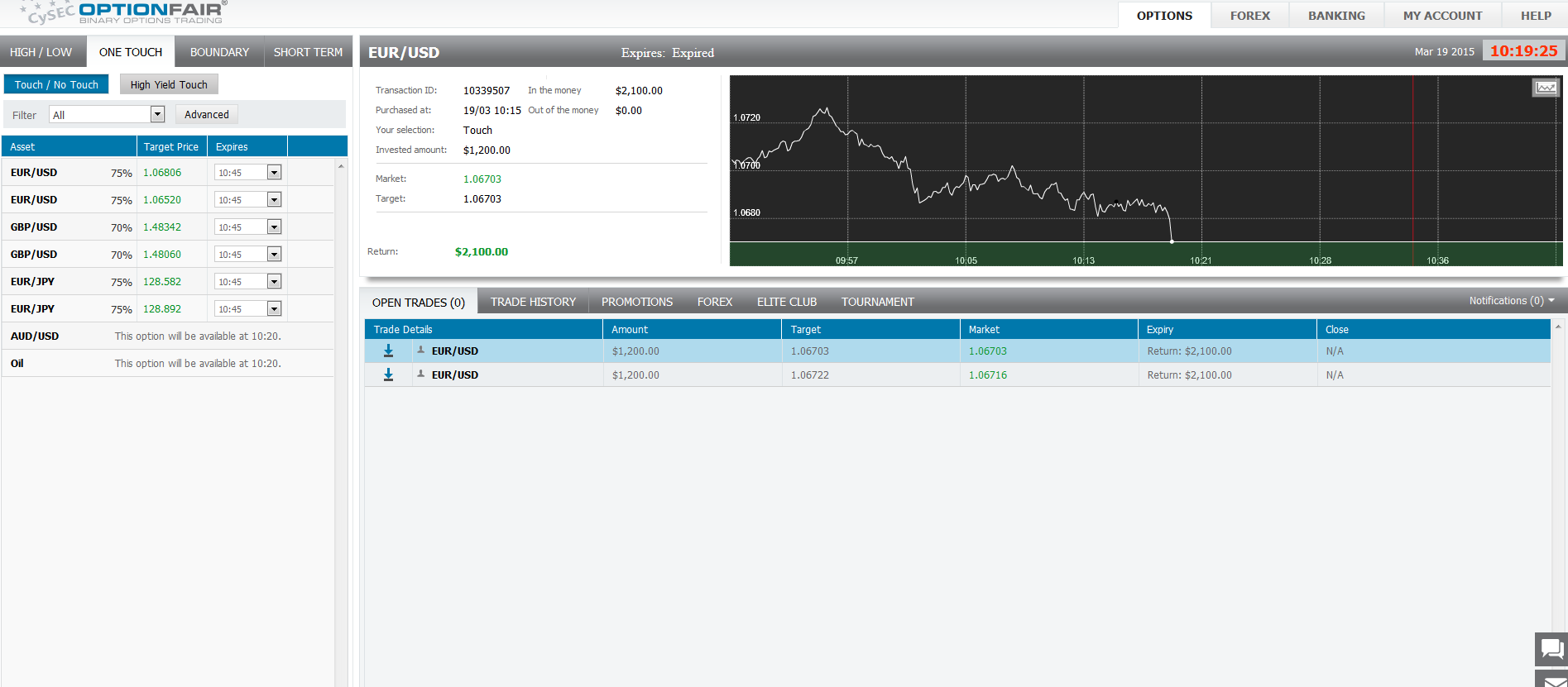 I logged in the OptionFair™ binary options trading platform and I traded $1200 on the "Touch Down" instrument. This kind of option has a return of 75% if the option touches the strike price prior to expiry, which means that if the signal is correct, I could get a return of $900 on my investment.