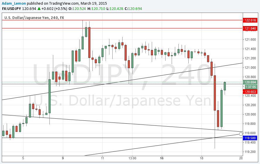This pair actually fluctuated by less compared to all the other major USD pairs following the FOMC announcement yesterday. The USD actually began to fall notably before the announcement, breaking through the bullish trend line cleanly and significantly. The FOMC pushed the price down to the supportive confluence of two older trend lines and the anticipated support at 119.79, from where it has risen. At the time of writing the price is not far from a previously supportive inflection point that may provide a short opportunity. Above that, there is the old bullish trend line that may also now become resistant. There is not enough clarity below to identify any good long opportunities within reach.