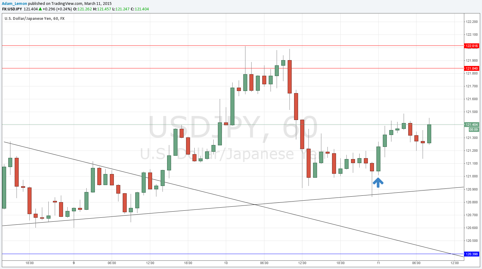 Yesterday’s signals provided a long off the nearest bullish trend line with the bullish reversal that occurred during the recent Asian session. An entry was possible at around 121.28 and at the time of writing it is in profit by about 15 pips. It would make sense to take partial profits or at least to take the risk off the trade at around 121.60 where it is likely to run into some resistance. Additional profits should be taken if and when the price runs out of steam somewhere between 121.84 and 122.00.