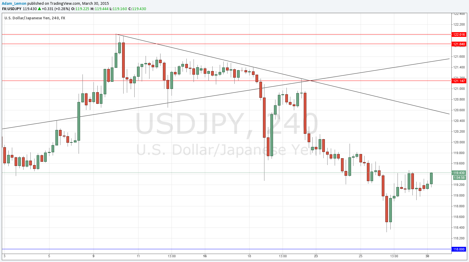 This pair was falling very steeply as the USD retreated and the JPY continued to recover. However with the recovery of the USD at the end of last week the price broke up above 119.25 and seems to be moving upwards right now. There are no particular obstacles in the way before the bearish trend line which is quite a long way above.