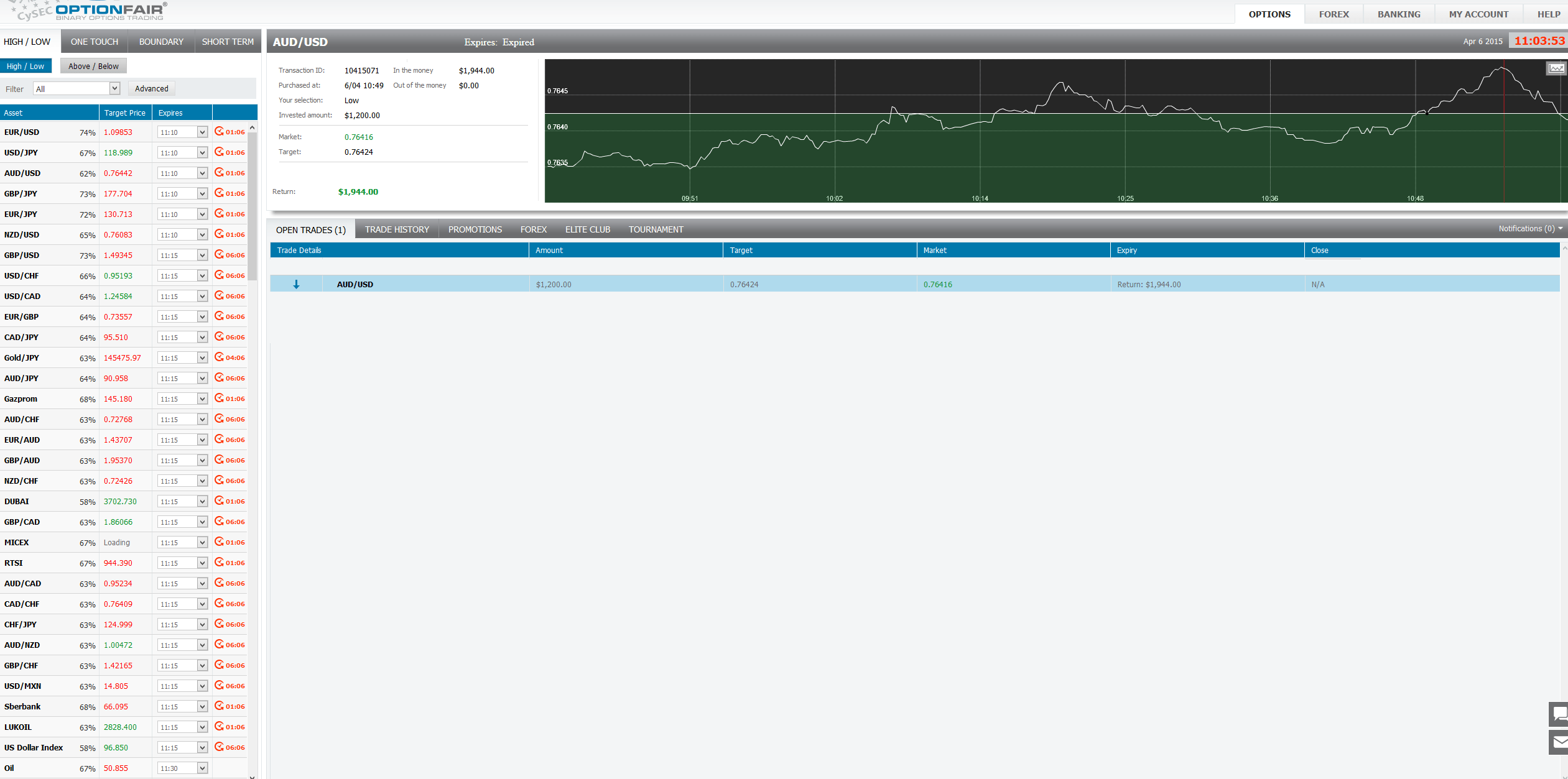 I logged in the OptionFair™ binary options trading platform and I traded $1200 on the "High" instrument. This kind of option has a return of 64% if the option touches the strike price prior to expiry, which means that if the signal is correct, I could get a return of $768 on my investment.