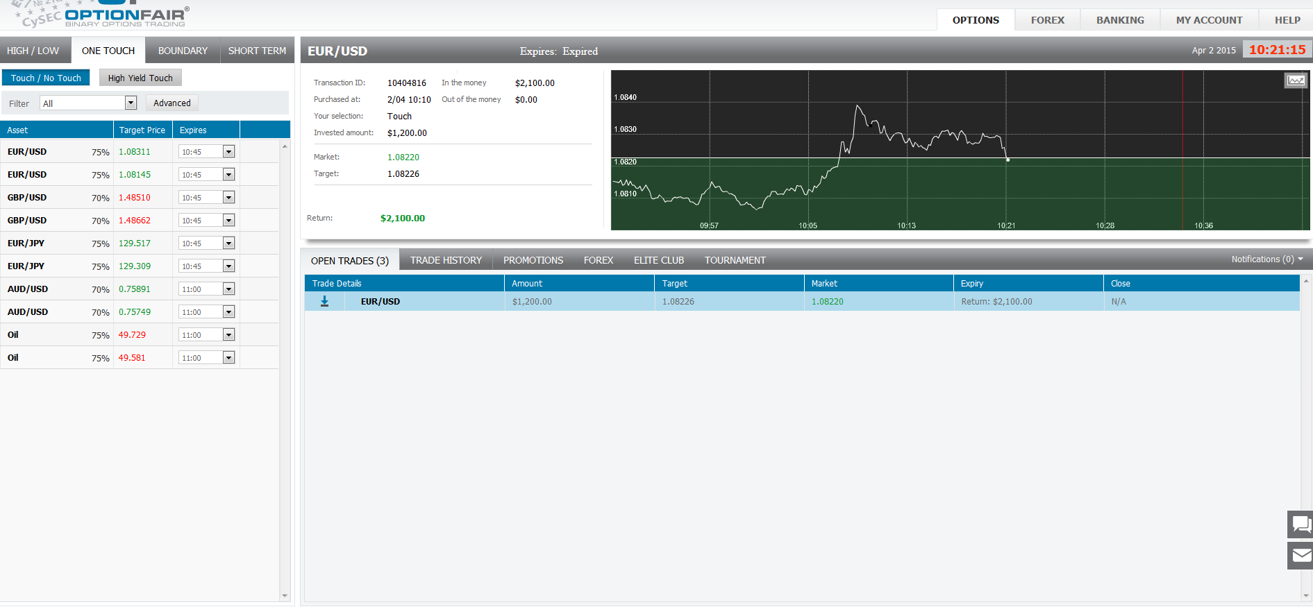 I logged in the OptionFair™ binary options trading platform and I traded $1200 on the "Touch Down" instrument. This kind of option has a return of 75% if the option touches the strike price prior to expiry, which means that if the signal is correct, I could get a return of $900 on my investment.