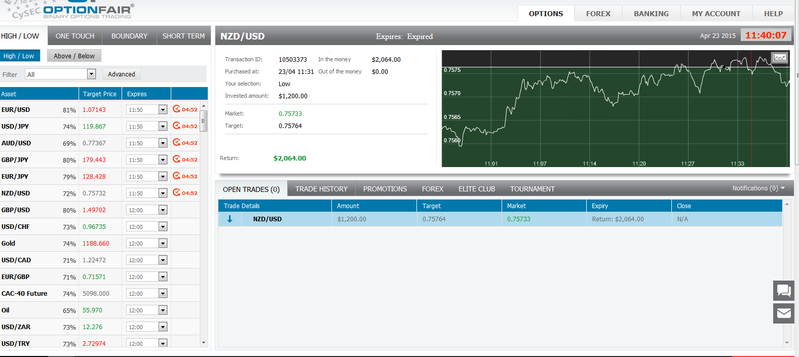 I logged in the OptionFair™ binary options trading platform and I traded $1200 on the "Touch up" instrument. This kind of option has a return of 75% if the option touches the strike price prior to expiry, which means that if the signal is correct, I could get a return of $900 on my investment.
