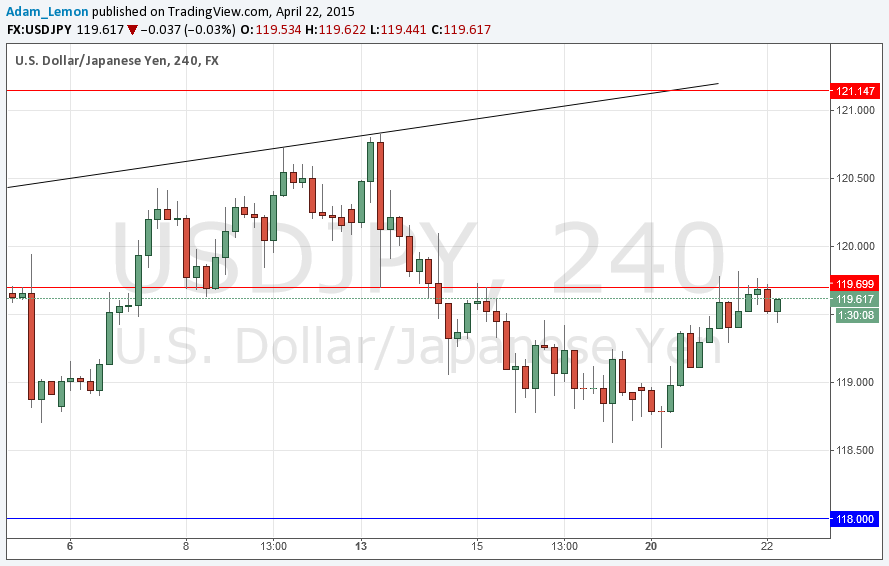 The potential resistance I identified yesterday at around 119.60 / 119.70 has held but not very steadily. The trend line has been removed from my chart as it has been messed around too much to still be valid. It may be now that this resistance holds and the JPY recovers against the USD. The odds would certainly favour a short rather than a long trade if entered blindly right now. However, unfortunately I do not see any safe levels for entry anywhere close to the current price.