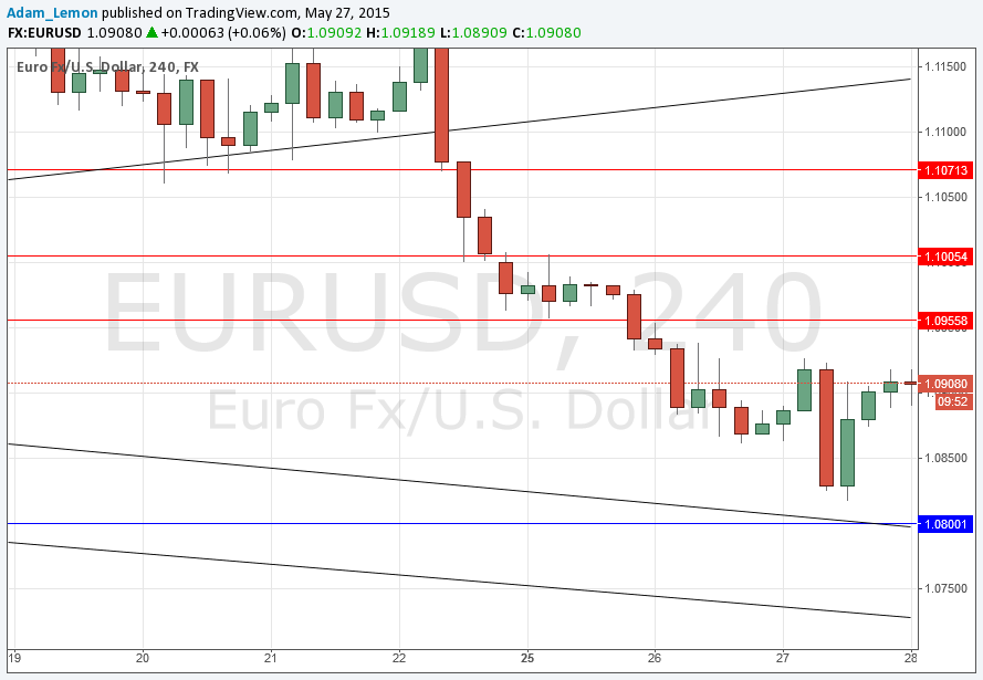 The pair fell sharply yesterday in line with the prevailing long USD trend, but when it came close to the anticipated support at around 1.0800 the price rose sharply, and we are now back where we started at around 1.0900. A period of consolidation looks likely and the mostly probably opportunity would seem to be a short off a move today up and rejection off 1.0956.