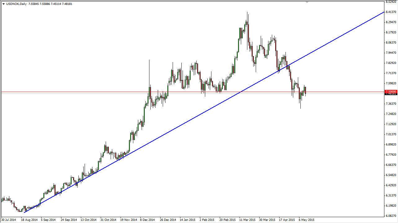 I believe that this pair is eventually going to break down significantly, and I think longer-term traders will probably be aiming for something along the lines of 6.80000 given enough time. I think that it’s very difficult to imagine hanging onto a trade like that for a lot of traders out there. However, as you trade Forex over the years, you will learn that the best and easiest way to make money is to simply hang onto the winners. The swap does favor Norway over the United States, so you also have that working in your favor. We have had a major trend line break, and those don’t come around all the time. I am very bearish of this pair over the longer term.