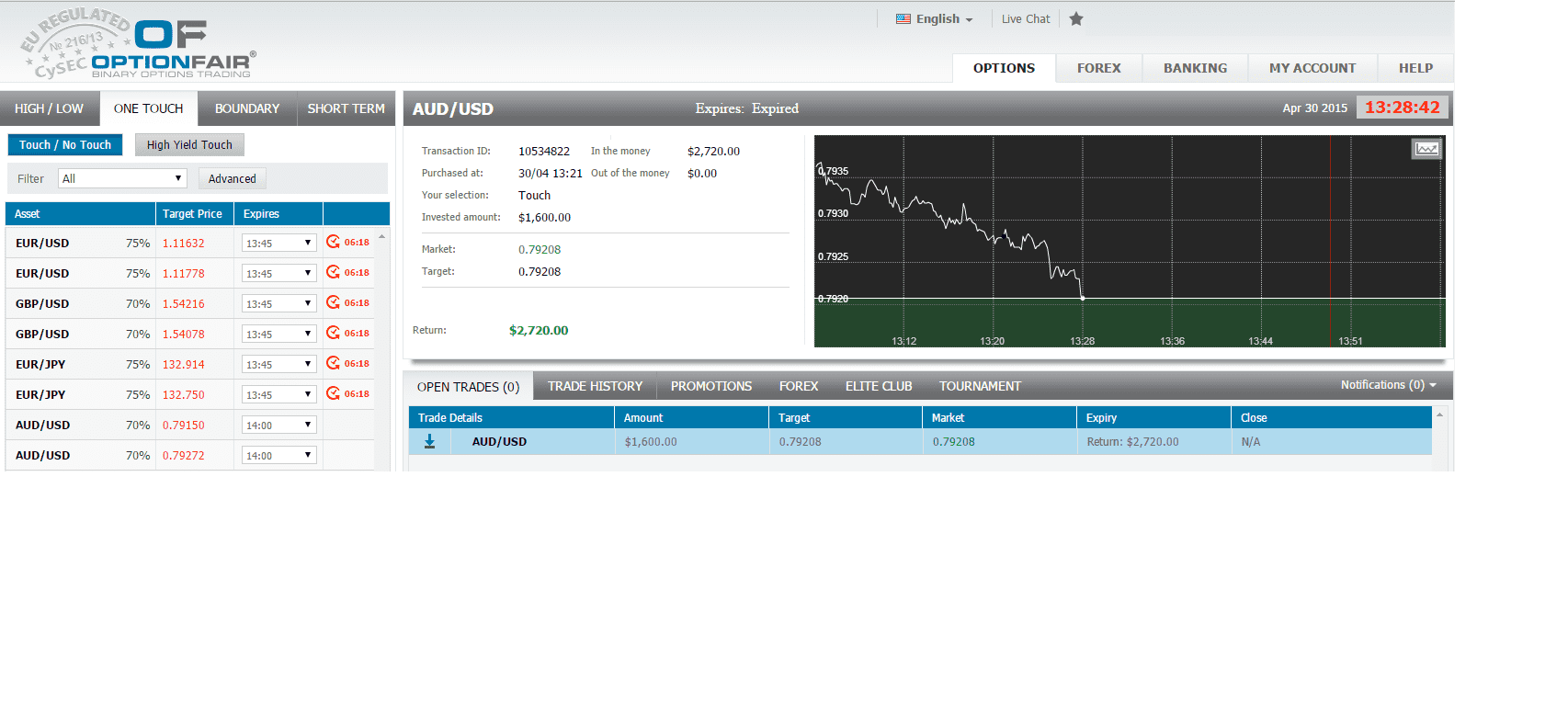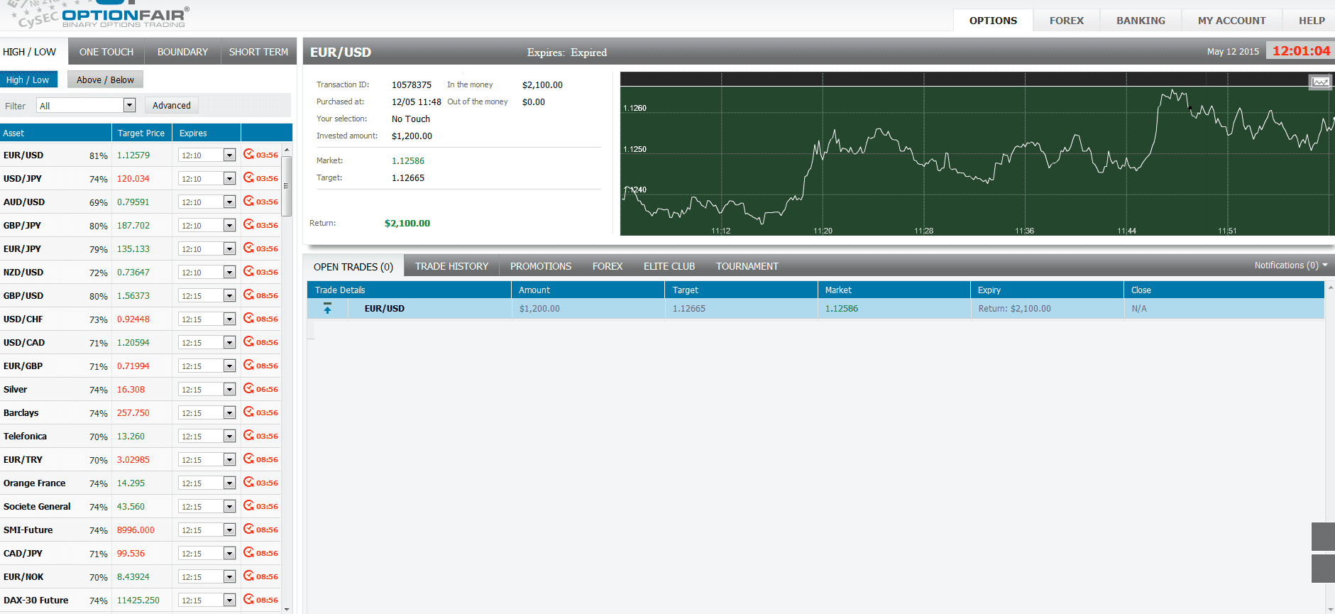 I logged in the OptionFair™ binary options trading platform and I traded $1200 on the "No Touch up" instrument. This kind of option has a return of 75% if the option touches the strike price prior to expiry, which means that if the signal is correct, I could get a return of $900 on my investment.