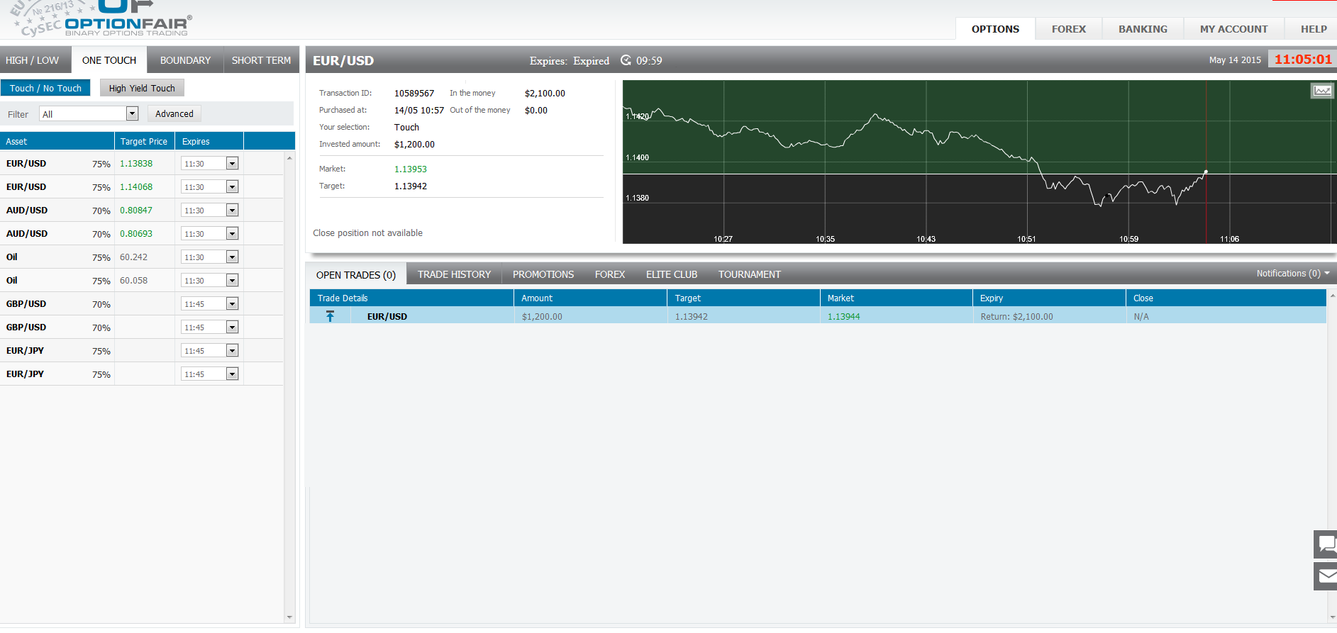 I logged in the OptionFair™ binary options trading platform and I traded $1200 on the "No Touch up" instrument. This kind of option has a return of 75% if the option touches the strike price prior to expiry, which means that if the signal is correct, I could get a return of $900 on my investment.
