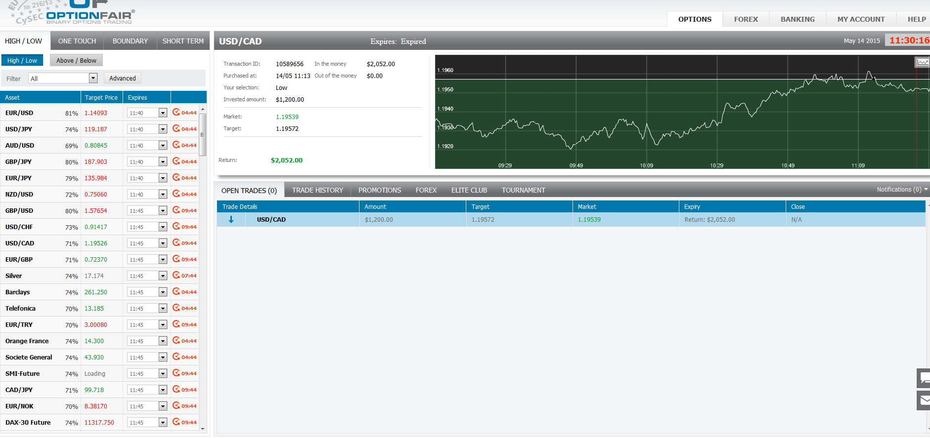 I logged in the OptionFair™ binary options trading platform and I traded $1200 on the "Low" instrument. This kind of option has a return of 71% so if the option will close below the target price, which means that if the signal is correct I could get a return of $852 on my investment.