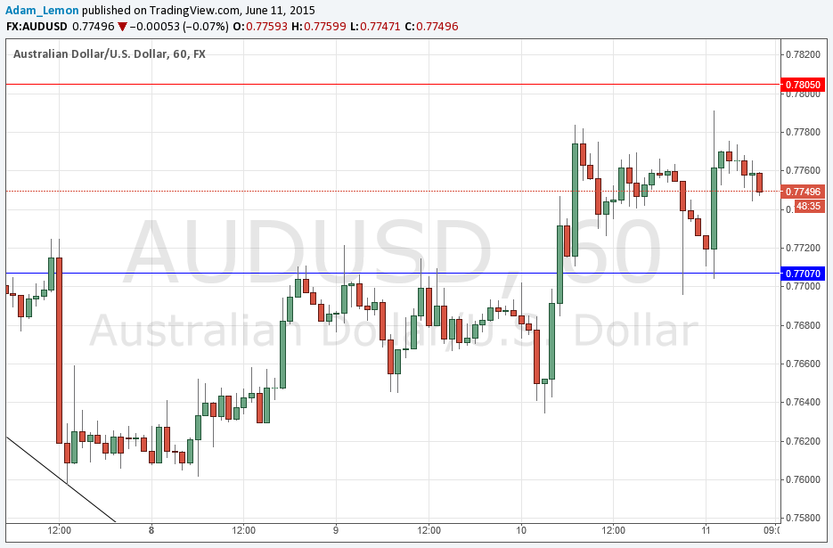 I expected yesterday that 0.7805 would hold, and that 0.7707 was likely to act as support. This scenario has come true, with the price falling yesterday during the late part of the New York session to 0.7707 and bouncing back with some momentum. The same thing happened a few hours later, but with less momentum. This suggests that the support there might be too used up to risk another attempt at a long entry, so the available key level we have to work with is 0.7805. An alternative would be taking a short after a break down past 0.7700 but that would be more risky.