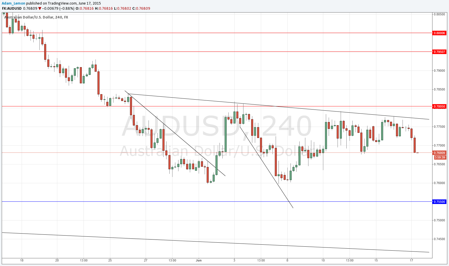 The AUD has been falling during the Asian and the London session as well up to this time of writing. It has reached local support at 0.7680 which may halt the fall. The double bottom at 0.7600’s round number confluence is likely to be more supportive but we are unlikely to get there before the FOMC releases after the London close today.