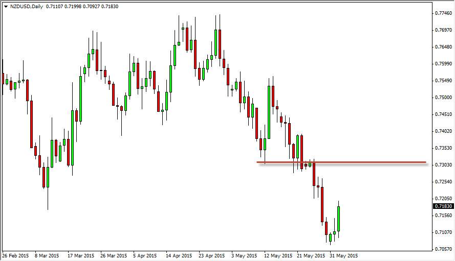 The New Zealand dollar is highly sensitive to the commodity markets, so as a result I think that it makes sense for the New Zealand dollar to be a bit volatile anyway. On the chart attached to this article, you see that I have a red line at the 0.73 region. That is the next major resistance that I can see on this chart, and as a result I think that is where we are going to head to the next. I don’t know whether or not we can get above there, but this bounce as I said before could send enough momentum back into the marketplace to finally break the New Zealand dollar down. It’s a bit early to suggest that perhaps the trend has changed, so I am only going to think about going long for the short-term, and towards the 0.73 level. If we can get above there, obviously I have to revisit a few things from a longer-term perspective.