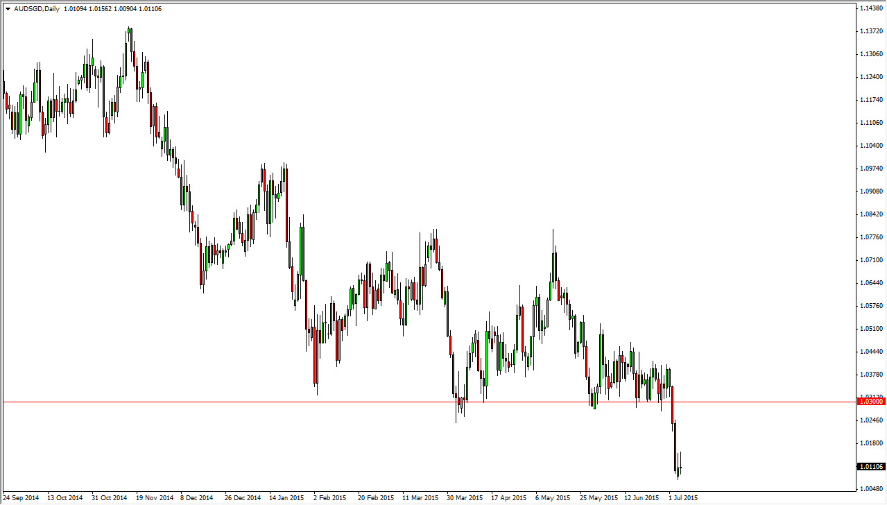 Needless to say, the Greeks voting against the referendum sent shockwaves throughout the marketplace. This of course wears upon “risky” currencies, such as the Australian dollar. However, there is also the concern coming out of Asia as the Chinese economy slows down. That of course hurts Australian exports, and send money flowing from the Australian dollar. The Singapore dollar of course is a bit of a safety currency as stated before, so a lot of Asian traders probably are starting to throw money and Singapore itself.