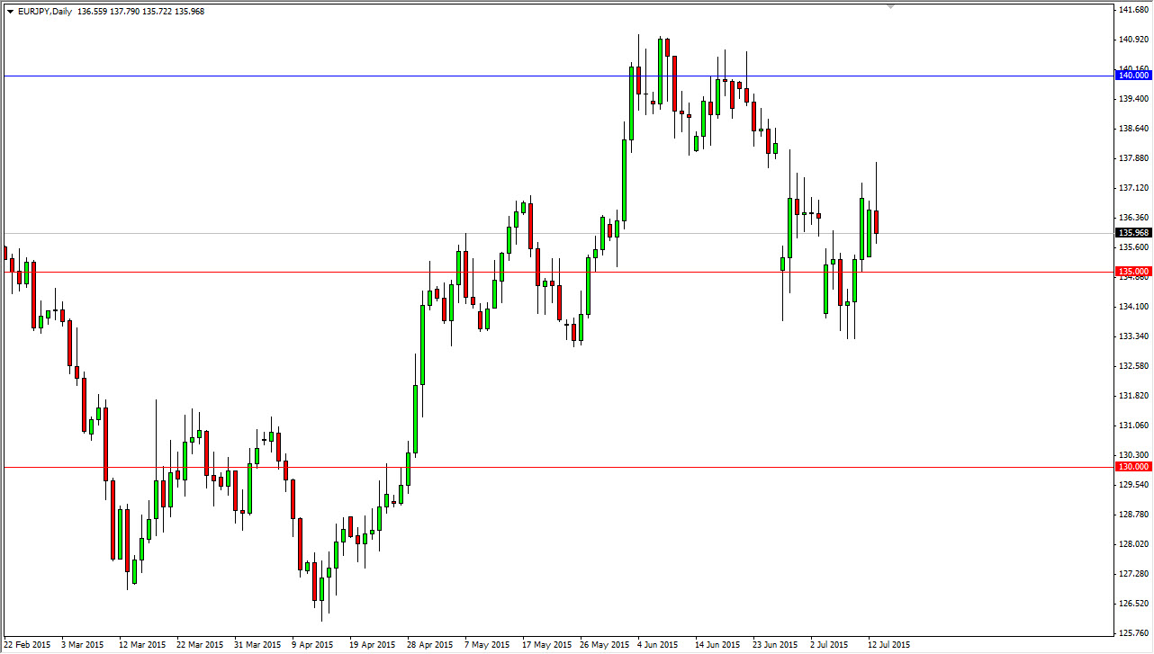 The EUR/JPY pair initially rallied after we got wind that the Greeks and the Europeans seem to be getting close to an agreement. The Euro in general rallied which you would expect, but ultimately the market sold off the Euro as there seems to be quite a bit of doubt surrounding the currency in general. With this, it makes sense that people would buying the Japanese yen, simply because it is considered to be one of the more safe currencies out there. When you are worried about the volatility and the viability of a common currency in general, it makes sense that you would go as far away from it as you can, and buying the currency of the country that is considered to be much more stable.