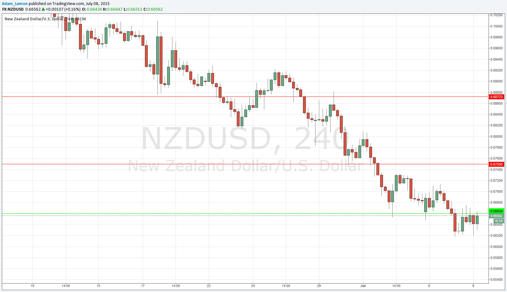 This pair had been the strongest trend going against the USD, however in recent days it has been overtaken by AUD/USD which has begun falling even more dramatically. This is underlined by the chart below which shows a short-term bottoming out at around 0.6620 and the price trying to break upwards past local resistance at 0.6660, shown as the green line. It is way too early to talk about a trend change of course, and the USD is strong everywhere, but a break up above 0.6660 could see a pull-back going all the way up to 0.6700 or 0.6750, which could then be a good level for renewing short trades.