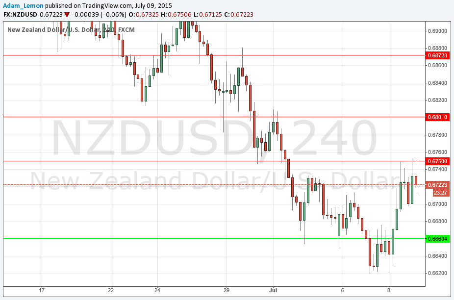 I forecast yesterday that a break up above 0.6660 (shown by the green line in the chart below) could see a pull-back going all the way up to 0.6700 or 0.6750. This is in fact what happened, with 0.6750 now acting as resistance and checking the move up.