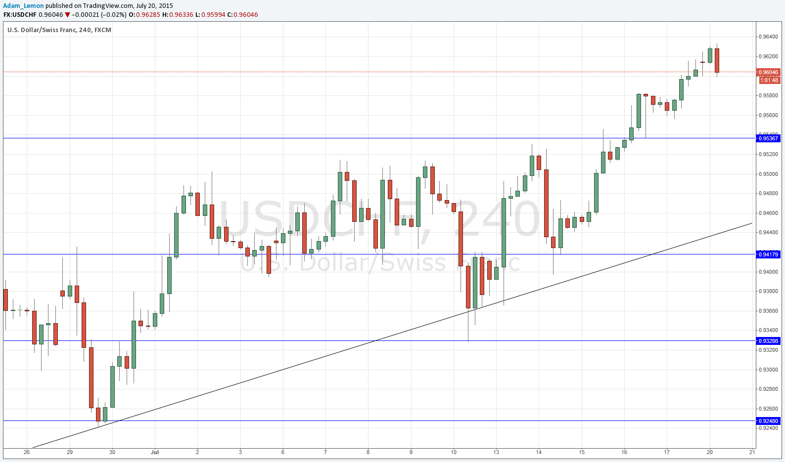 We have had more USD bullishness and, more surprisingly perhaps, CHF weakness. This pair has been consolidating ever since January’s historically unprecedented price shock, but during recent weeks this consolidation is beginning to take on a bullish bias.
