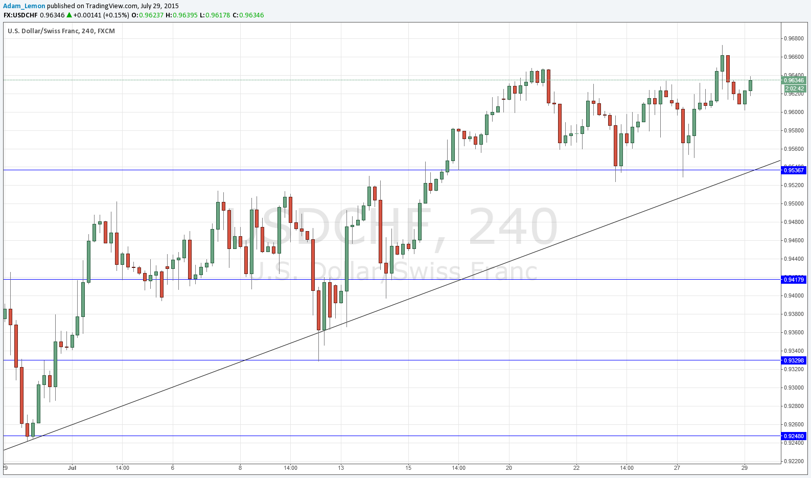 No key levels were hit yesterday but the price is generally holding up quite bullishly and the bullish trend line continues to be intact. The trend line and 0.9537 are quite confluent so might give powerful support if the price returns there. Conversely a strong break below both might lead to a sharp fall down to around 0.9425.