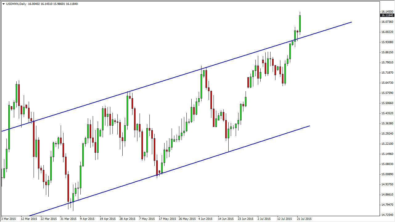 The USD/MXN rose during the course of the session on Wednesday, breaking above the 16.11 level. This coincides nicely with a significant breakdown in the oil markets, as we found ourselves trading below $50 for the first time in ages. With this, it makes sense if the Mexican peso should continue to break down overall, as the Mexican peso is highly influenced by all of the oil rigs in the Gulf of Mexico. Cheaper oil means less profits for Mexican oil drillers, and as a result less money and exports to their number one customer, the United States. In other words, this is a very clean way to play the petroleum markets if you have the ability to trade this pair.