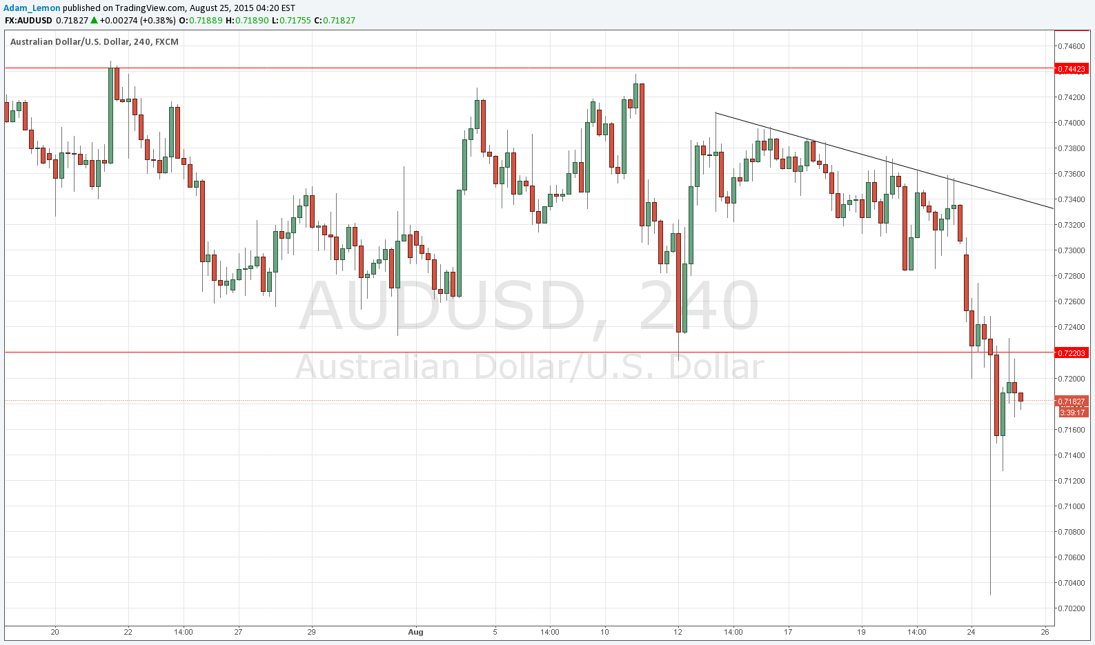 Being very directly exposed more than most economies to the Chinese crisis, and being a very exposed economy anyway, it was not surprising that the Australian dollar was greatly affected by the huge volatility yesterday. However the price managed to recover over a few hours against the USD to more or less get back to where it was previously, at 0.7220. This level has become important as it was previously the site of a double bottom, and it seems to have now flipped to act as resistance. While we have plenty of obvious resistance above, it is very difficult to identify likely support, as we spiked yesterday all the way down to 0.7030. If anything, this suggests that if we get down to the key psychological level of 0.7000, it will be likely to be very supportive.