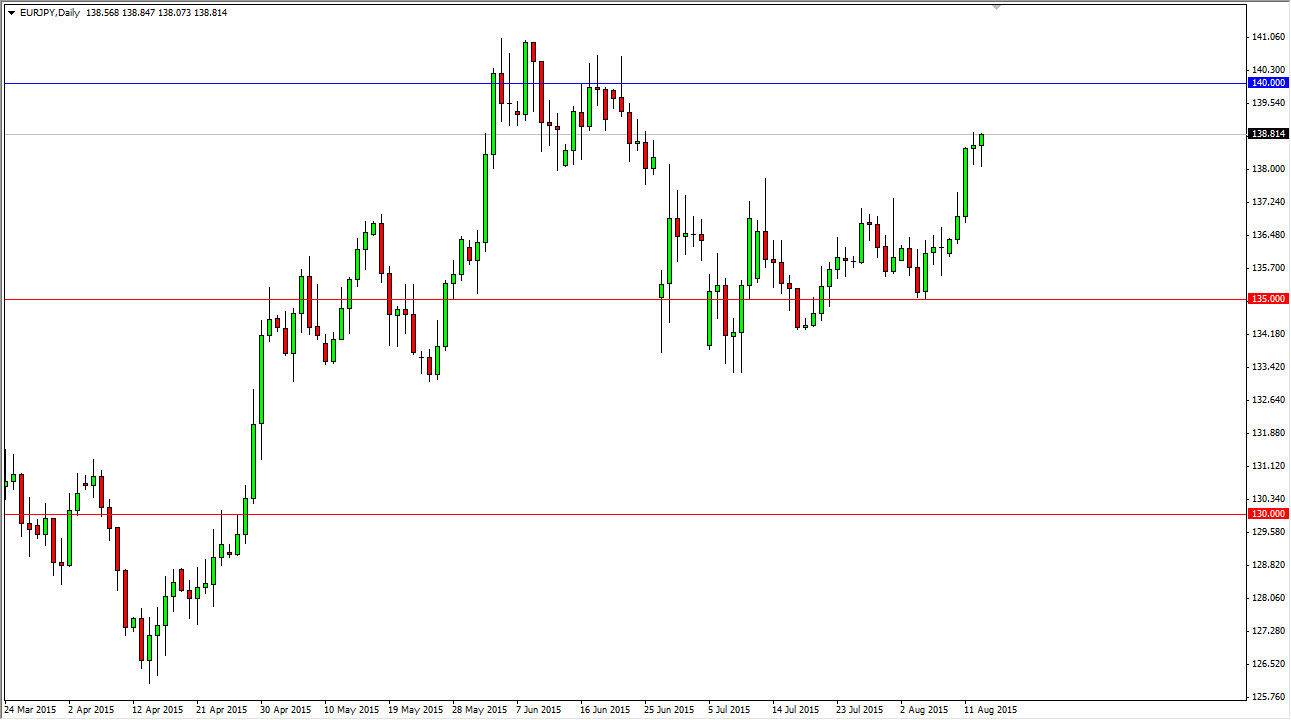 The EUR/JPY pair initially fell during the course of the session on Thursday, but found enough buying pressure near the 138 level to turn things back around and form a hammer. That hammer of course is a very bullish sign, and as a result I am a buyer of this pair if we can break above the top of the range for the day. Breaking above the top of that candle sends this market looking for the 140 handle, which is my longer-term target anyway. I do recognize that the 140 level will probably be pretty resistive, so at this point in time I do not expect the market to break above there with any type of disease.