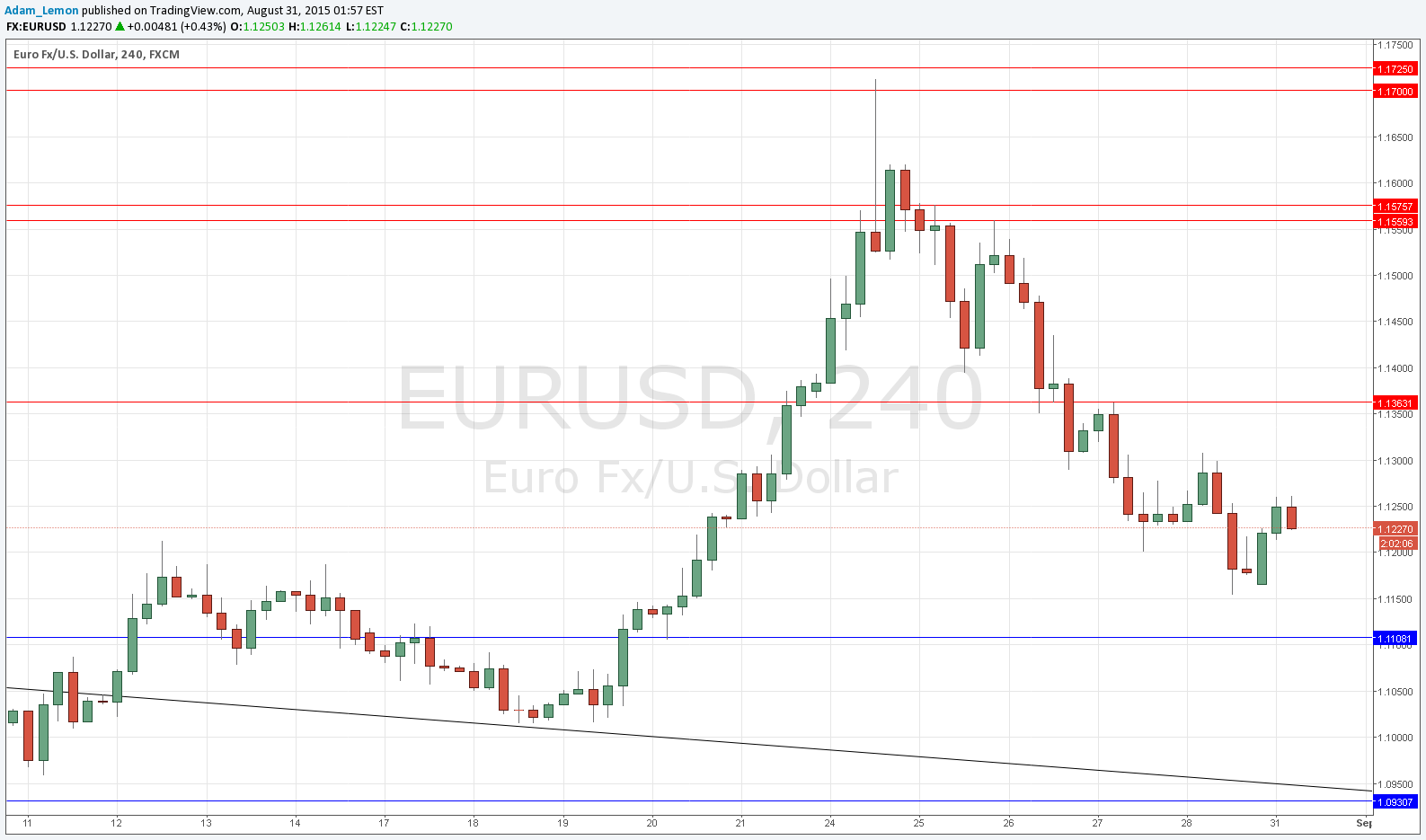 This pair continued to sell off last Thursday before finally stabilising somewhat on Friday. Wild moves such as these make it hard to judge where support and resistance levels lie and whether they are going to be relevant. However now there is some stability it seems clear that the price is free to range between 1.1108 and 1.1363, with some local resistance at around 1.1300 likely so today that is very certain to act as a maximum cap on the price. It is hard to say exactly what will happen next in the short term, I suspect consolidation is most likely.