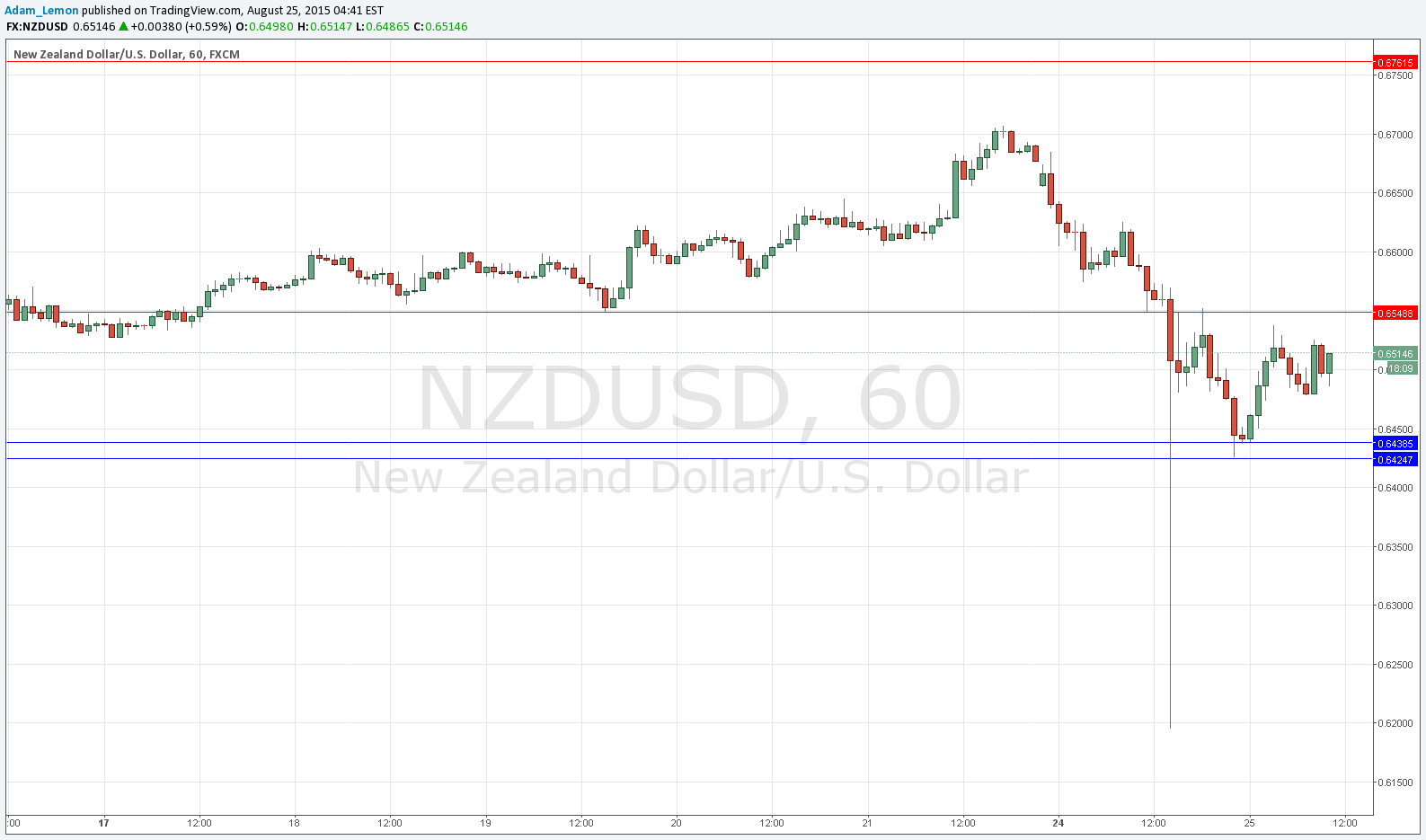 This pair behaved very like its sister pair, AUD/USD, yesterday during the very heavy volatility. However there was a difference: the NZD came back more strongly against the USD to be unchanged and is now even rising above that level. Although the spike down reached all the way to just below 0.6200, we can see after another move down that there was a supportive zone from 0.6438 to 0.6425, so that is the next spot to look for support. Above, there is a new flipped support to resistance level at 0.6549.