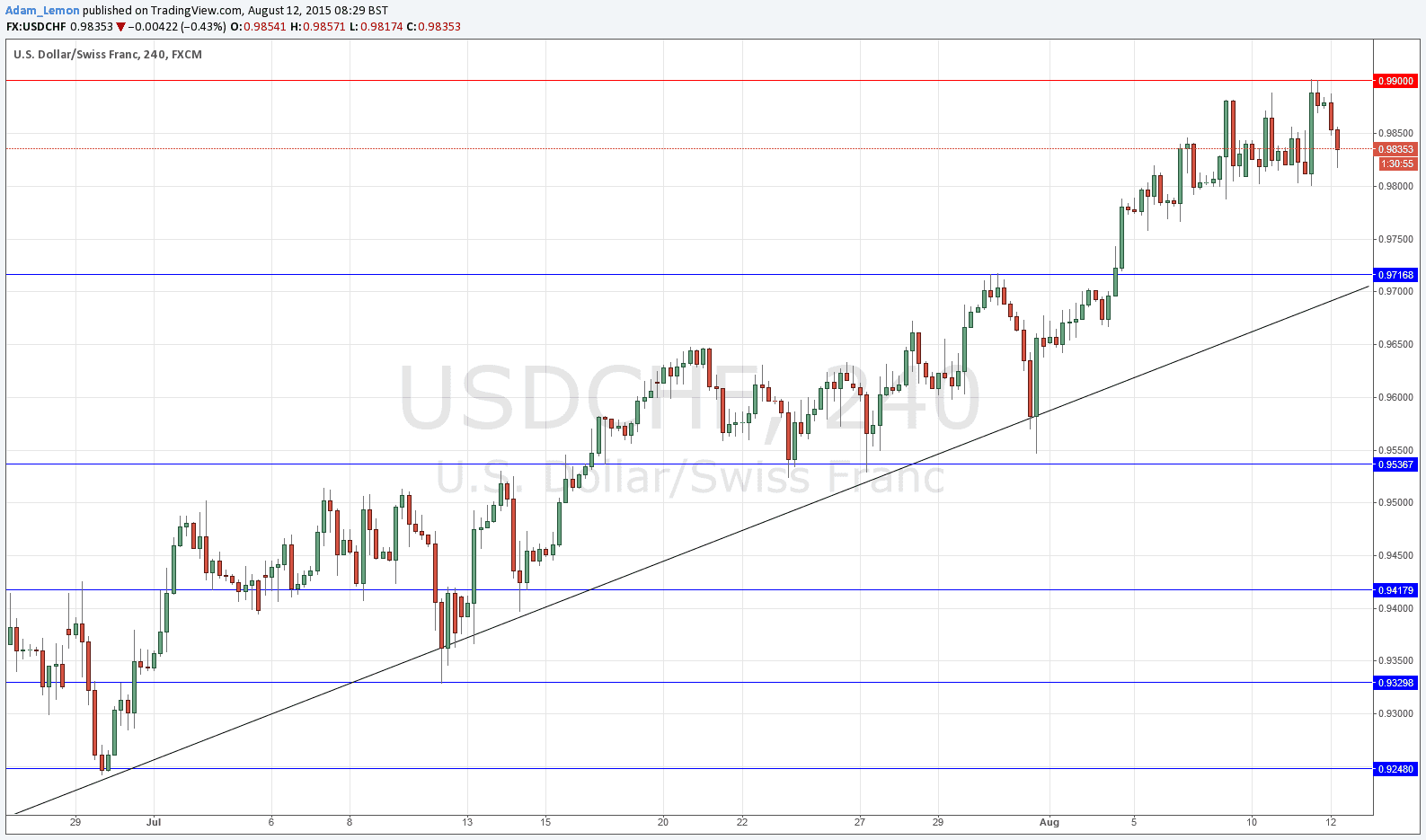 My forecast yesterday was completely right: resistance at 0.9900 and an overdue pull back. We have had both over the past 24 hours. The question is what will happen next. All the key levels are there. We may either just chop around in the area at 0.9800, or perhaps finally get a deeper pull back to the trend line. When the USD is strong it lately likes to rise most against the CHF, so it will take a deeper pull back in the USD generally to get there, as any central bank input on the CHF side will probably remain lacking. The bullish trend line is now almost confluent with key support at 0.9717 so even at 0.9725 or possibly as high as the psychological level at 0.9750 this pair will probably look like an attractive buy to the market.