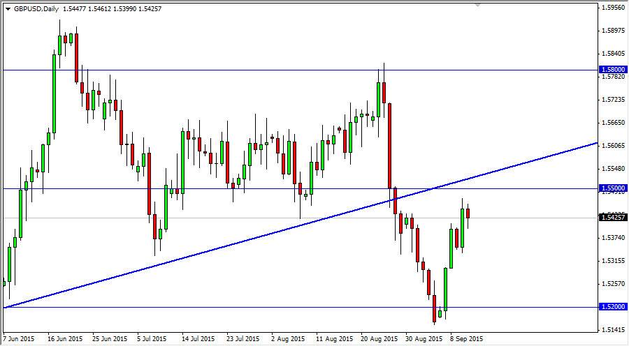 That being said, it does look like the market is trying to bet against the Federal Reserve, so a break out to the upside is possible. If we break above the top of the uptrend line we could very easily find this market reaching towards the 1.58 level if the Federal Reserve disappoints the markets in general. Ultimately though, I think this week will determine where we go over the next several weeks if not months in this particular currency pair as well as many others. With that, expect a lot of volatility but I think sooner or later we will get clarity that should be easy to trade.