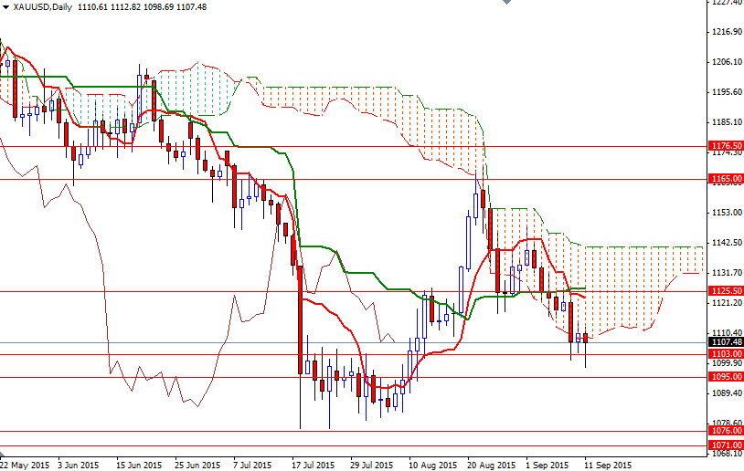 Gold prices settled at $1107.48 per ounce, falling nearly 1.42% over the course of the week, as calmer financial markets and generally positive U.S. economic data eased demand for the perceived safety of the metal. The XAU/USD pair dipped to a low of $1098.69, a level last seen on August 11, before bouncing back to the $1107 area. Gold has been struggling for some time because of the persistent improvement in U.S. data and perception that the likely timing of the first Fed rate increase since 2006 is drawing closer.
