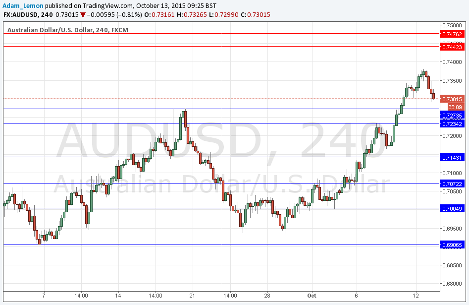 It seems that the pause I was expecting yesterday in this pair’s strong advance came a little early, as we have been retreating from the high made at 0.7382. It looks quite likely that the price will reach anticipated support later today at 0.7274.