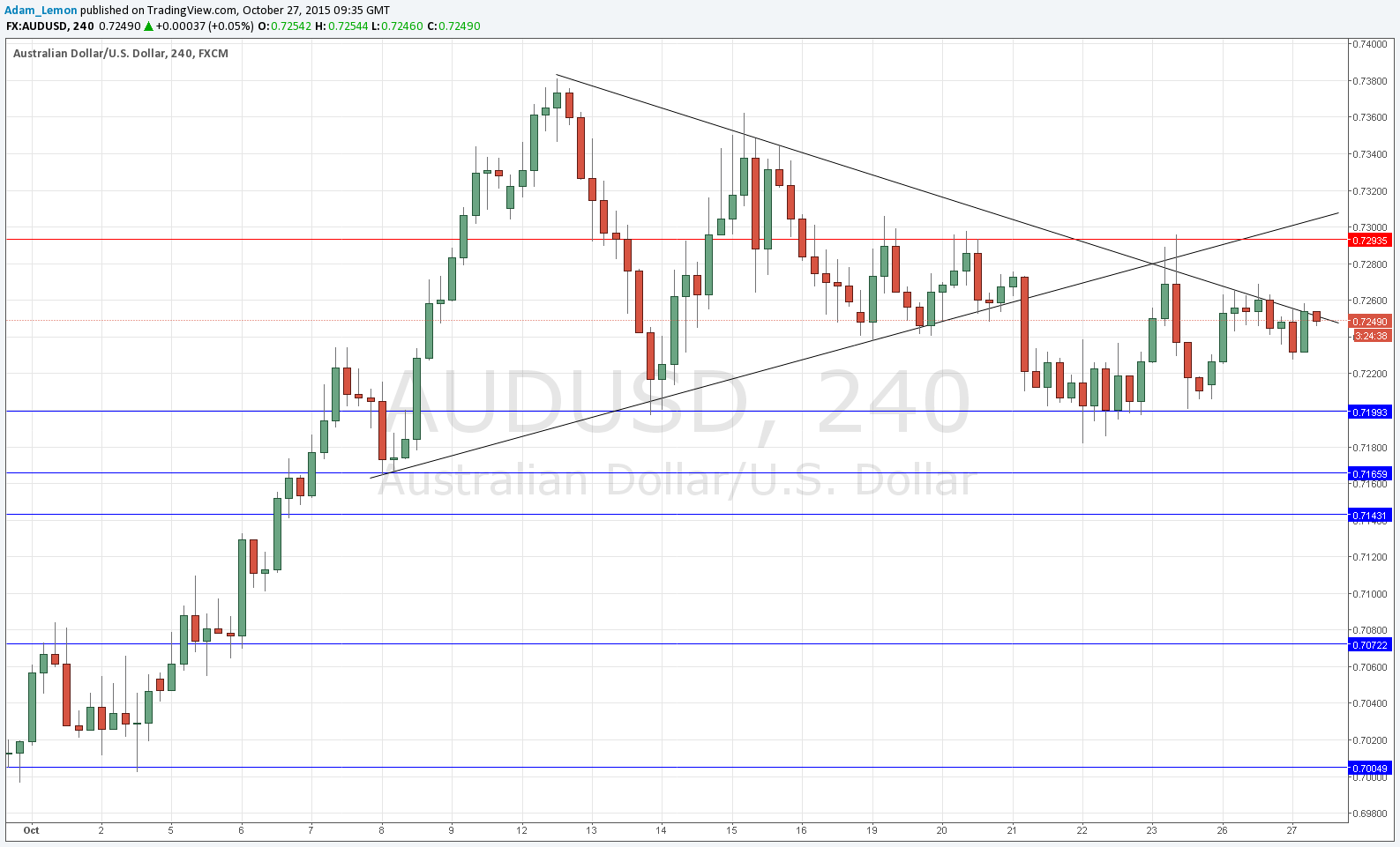 The technical picture is very interesting with both trend lines shown on the chart below having acted as good resistance during recent swings. We seem to be reversing off a rejection of the nearest trend line that happened earlier today near the beginning of the London session. It suggests a move down to test support at 0.7200 again, but it may be difficult to overcome the minor support that is probably there at around 0.7250.
