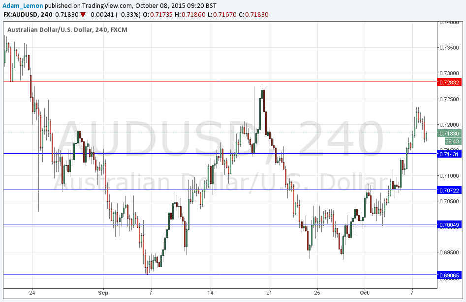 This pair was the second strongest mover of all the major dollar pairs, but came off the boil last night as the USD recovered somewhat. Although the price has not quite got back to 0.7143, it might be finding support at 0.7165 which was previously minor resistance. A further move down to 0.7143 could provide an excellent opportunity to get long, especially if it happens before the FOMC Meeting Minutes are released.