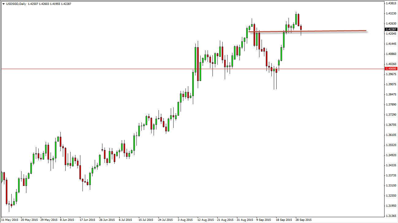 The US dollar fell against the Singapore dollar during the beginning of the session on Wednesday, but found support at the 1.42 level. This is an area that has previously been supportive in the fact that we formed a hammer is also a very positive sign. Because of this, if we break above the top of the hammer I like buying this pair as it not only is in an uptrend, but the hammer itself is a very positive sign. I think at this point in time the market will continue to go higher simply because of the lack of interest in Asian economies right now. Remember, Singaporean banks tend to be the financiers of Asian construction, and Asian economies are slowing. In that scenario, it makes sense that people would prefer to own the US dollar over a funding currency in the Asian theater.
