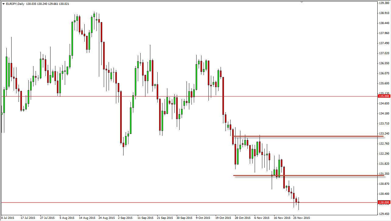 The EUR/JPY pair broke down during the day on Friday, slicing below the 130 handle. By doing so, the market turned back around to form a bit of a hammer, and that of course means that we could very well bounce from here. However, I do not look at any bounce at this point in time as a buying opportunity, because quite frankly the bearish pressure on the Euro in general is far too strong to be messed about with. I think that the European Central Bank could very well add more stimulus, and that of course will continue to work against the value the Euro overall.