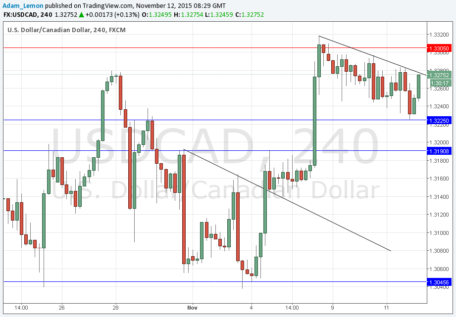 The price continued its small, mild bearish flag pattern yesterday, but found support a little lower than expected at 1.3225 instead of 1.3237. Since it touched that level, it has been rising with relative strength. All probably now depends on the upcoming USD news release. All the technical levels remain the same, with the exception of nearest support now at 1.3225.