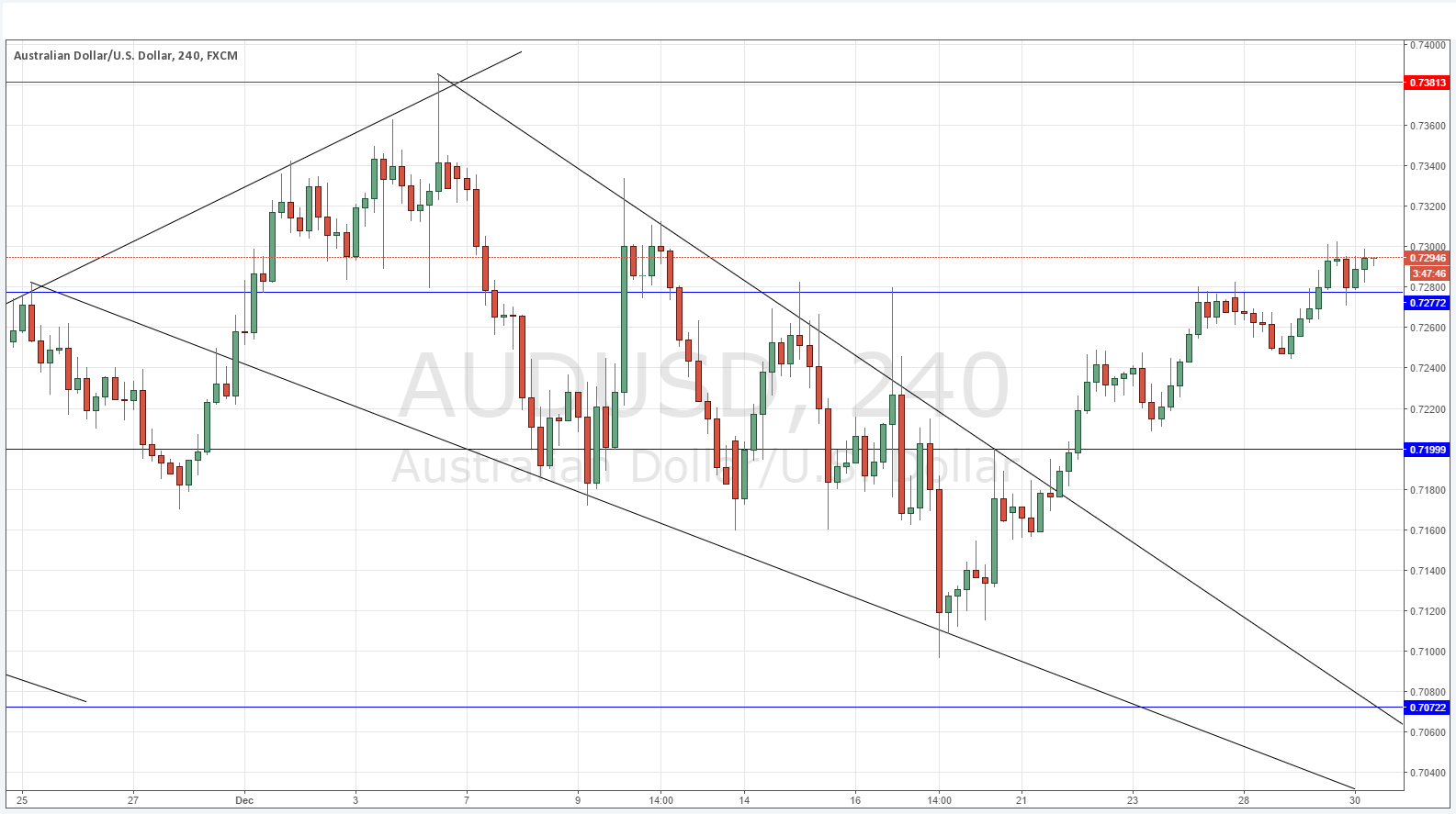 I wrote yesterday that if the price was able to break up above resistance at 0.7280, there is a good chance it might rise quickly up to at least 0.7340 or so. We have had a repressed but clear break up above that level, although the price has not really taken off yet. However I think it is significant, as a close examination of the chart shows that this level has clearly flipped from resistance to support. If the level is tested again and gives a bullish bounce, this will be a sign that the price is on its way up to 0.7381, although there seems to be a whole zone of resistance starting at around 0.7350 or so.